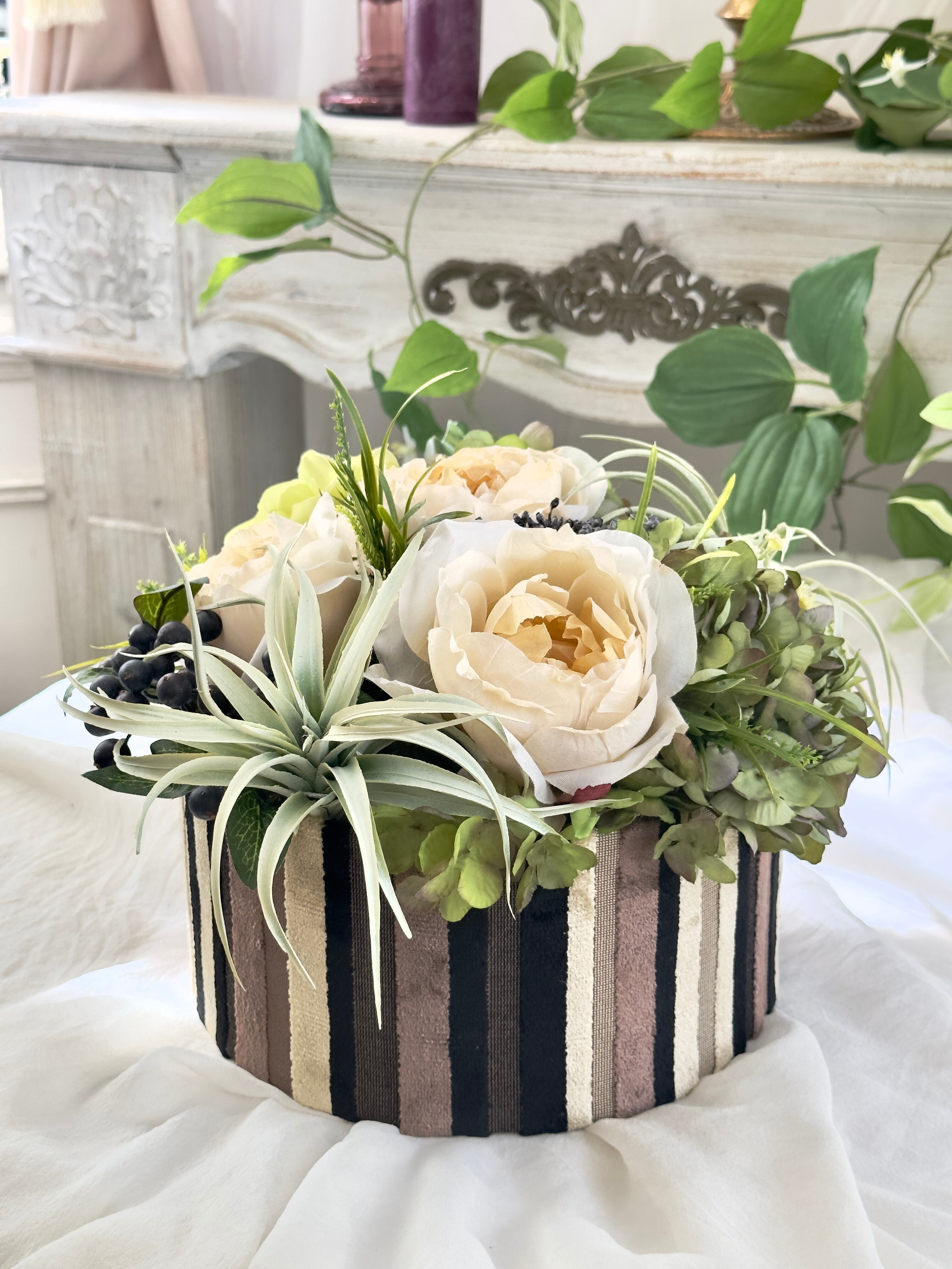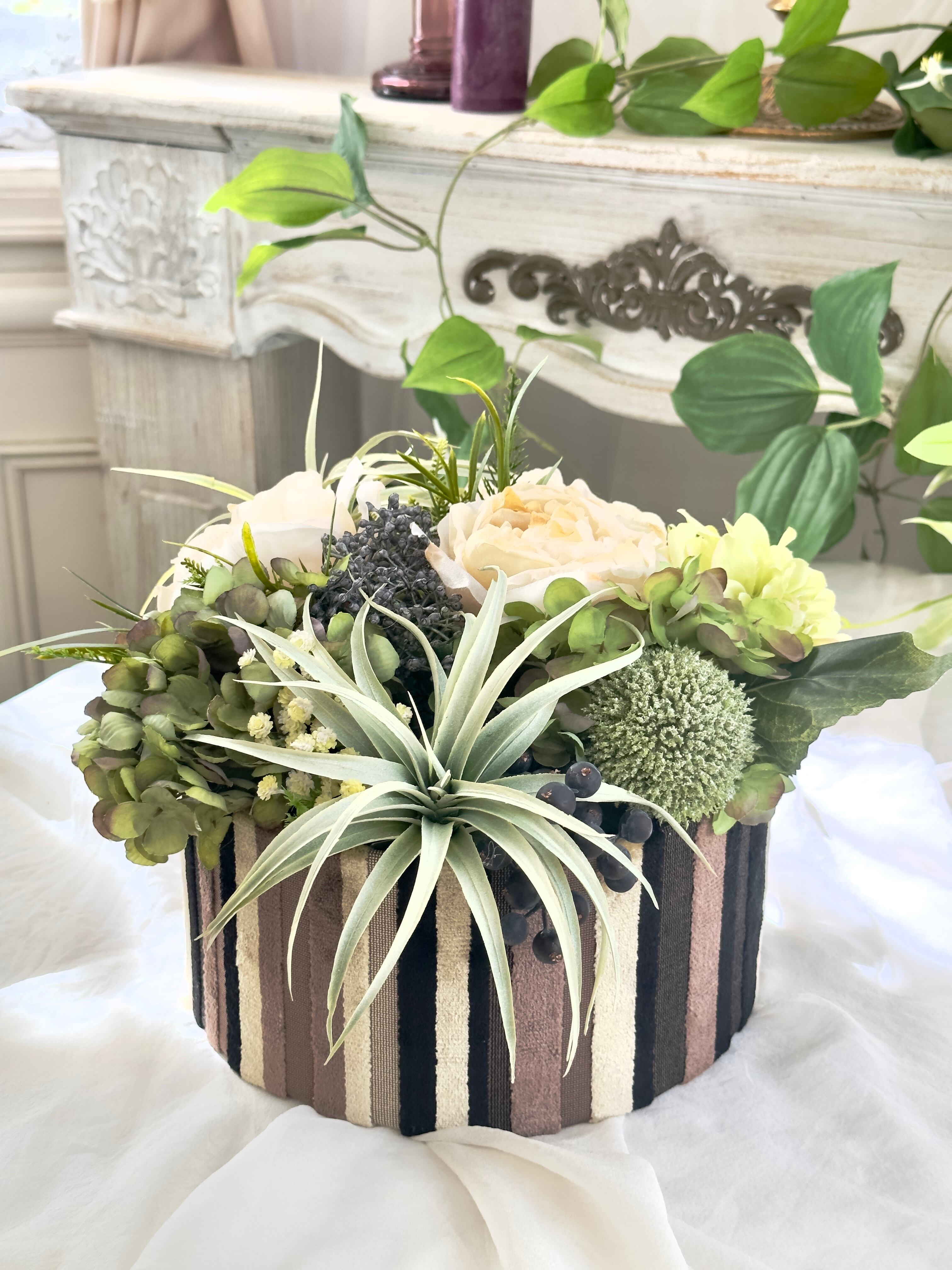 器はインポートの上質なfabric(フランス製)を使用し、カルトナージュ技法で手作りされた一品です。高さ23㎝、直径30㎝のサイズで、存在感のあるアレンジメントがお部屋を彩ります。